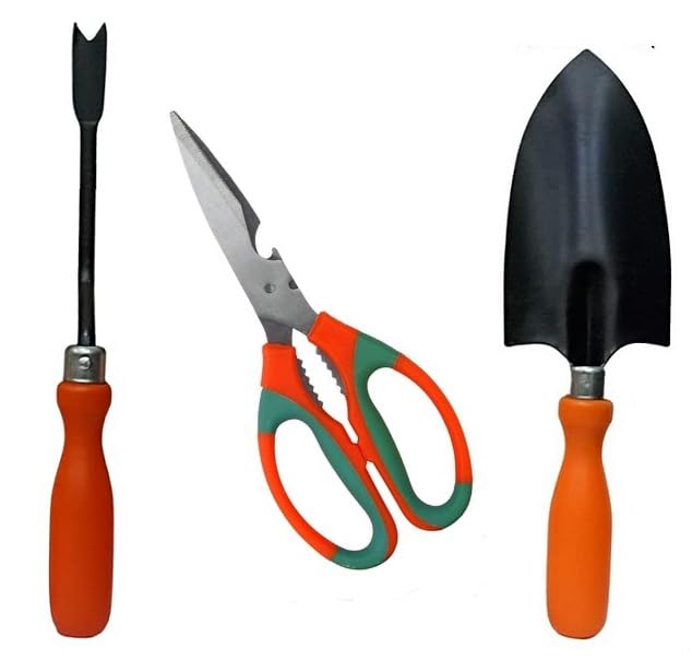 garden tool set includes 3 Pieces useful hand garden tools :Big Trowel, Weeder, Scissor. They can meet your gardening needs such as digging, weeding, loosening soil, aerating, planting, weeding and more.The gardening work set is made of heavy material, which is long-lasting, strong and durable, and no need to worry about breaking. This heavy duty garden kit is crafted for durability, can withstand the toughest roots, rocks, and soil.