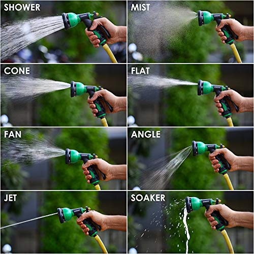 Garden Spray Gun Comes With 8 Different Functions The Aepigo Water Spray Gun Has 8 Kinds Of Watering Setting Which Can Be Easily Adjusted By The Spin-Click Spray Selector Which Are Centre , Vertical , Flat , Full , Shower , Mist , Cone & Stream.