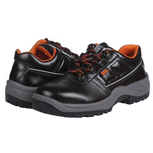 Black+Decker lace up safety footwear in black grain leather, soft orange lining outsole and grey mid sole with molded in-socks. It is uniquely designed low ankle safety shoe with steel toe having double density pu or pu sole, metallic d- ring and flat laces for knotting grip, foam padding in bellow tongue to enhance fit and comfort with cushioned top line for extra comfort, oil or mild chemical resistant with anti-slip and sweat absorbing properties. It is ideal for automotive, transmission, construction and electronic industry. It comes with a pair of socks and cotton shoe bag.