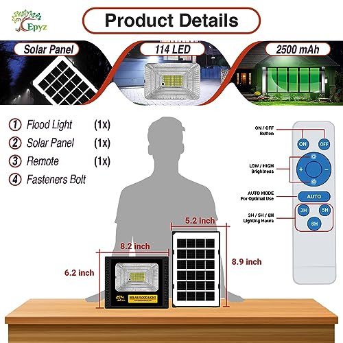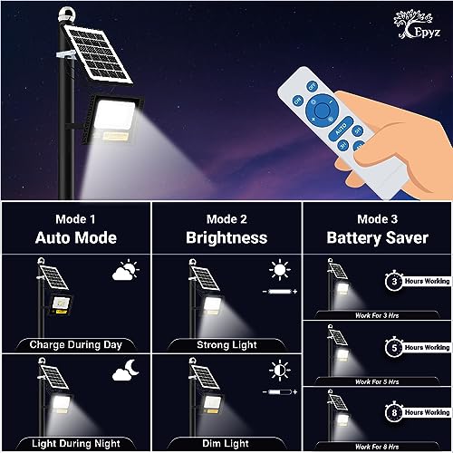 ☀Solar Flood Lights Remote Control/Lights sensor/Automatic☀:Epyz Solar flood light will turn on at dusk and turn off automatic when you turn on the Solar Lights with Automatic Model. Auto on/off/2H-6H time setting/Energy saving setting,you can control the ON/OFF of this solar lights 20-30 ft away distance with the IR remote control , and the IR remote control has many different lighting modes