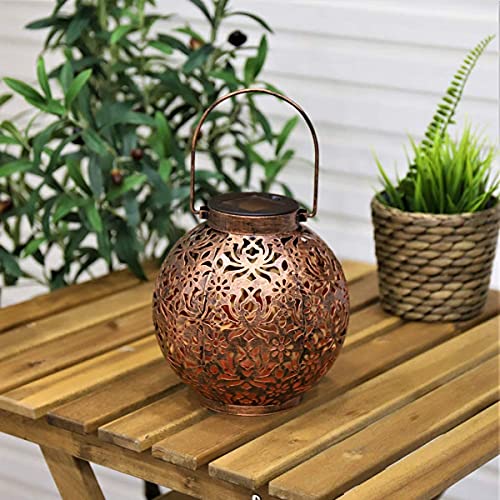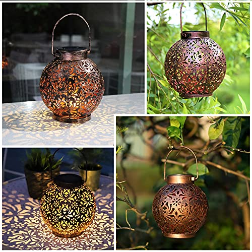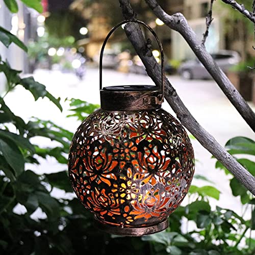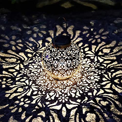 Solar lights outdoor decorative: Crafted from premium corrosion resistant metal, this solar hanging lantern has a vintage hollowed-out pattern with metallic coating, when it lights up the shadow on the ground