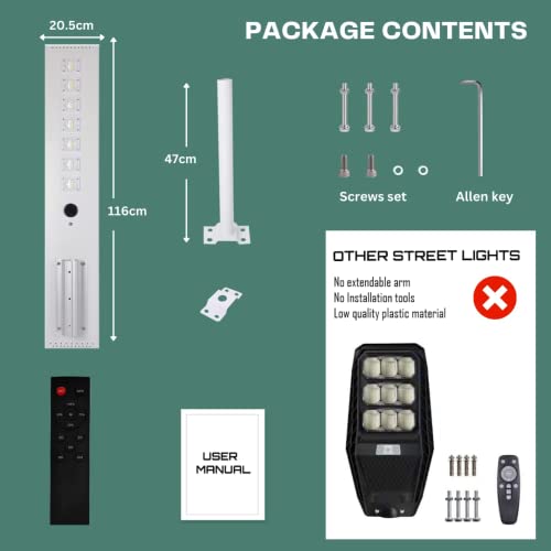 [WEATHER-RESISTANT]: These Solar Street Lights are constructed using aluminium alloy, making them resilient and corrosion-resistant, even when exposed to extreme weather conditions throughout the year. With an IP65 rating, they are specifically designed for outdoor use, and their sealed casing ensures that water and other particles cannot accumulate inside the Outdoor Solar Lamps