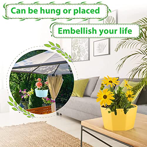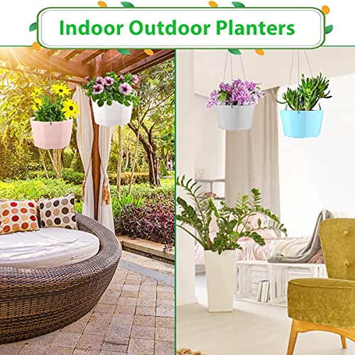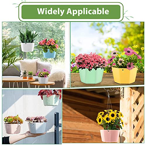 GREAT AFFRODABLE HANGING PLANTS POT: Including 6pcs hanging plant basket with different colors, durable and beautiful hanging baskets for balcony, porch, front door, garden. Also coming with 6 metal hanging chains with hooks, 6 water filteration boards, great home hanging plant basket kit. Vertically hanging basket pot is for easy space saving, easy to install or remove, can be freely hung on any handrail, windowsill, shelf, garden fence, etc.