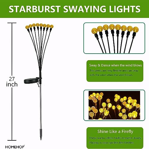 【 Solar Powered Firefly Garden Light For Perfect Garden Decoration 】 Homehop solar light for home garden patio lawn are designed with flexible branches and bright LED bulbs, which can sway and dance with the wind and looks like fireflies flying in the yard. The solar lamp for outdoor home garden have 2 lighting modes ( Steady On & Flash Mode) which can add a lot of vitality to your garden, and create a romantic atmosphere.