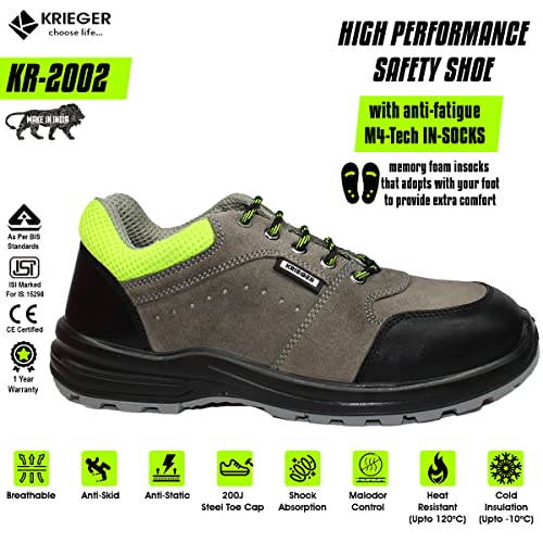 Krieger KR 2002 High Performance Safety Shoe with Anti-Fatigue insocks, Anti-Skid, Heat, Water, Oil & Acid Resistant, 200J Steel Toe Cap, ISI Marked, CE Certified, BIS approved, Size 10 INDIA/UK