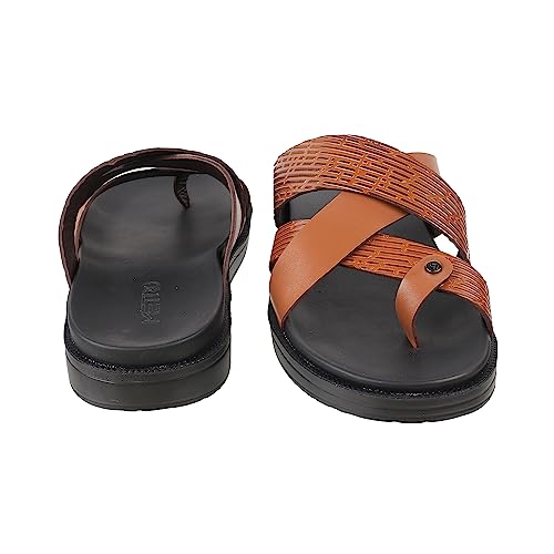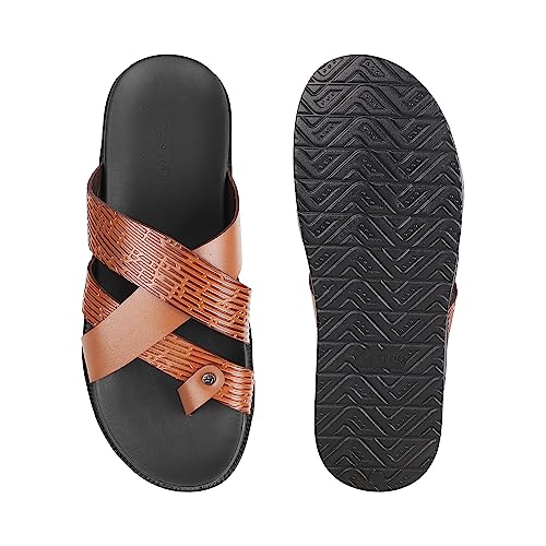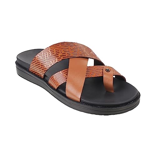 Flat-heeled slip-on slippers designed for men, featuring a fashionable tan color for casual wear. These slippers offer comfort and stability without the need for laces or straps.