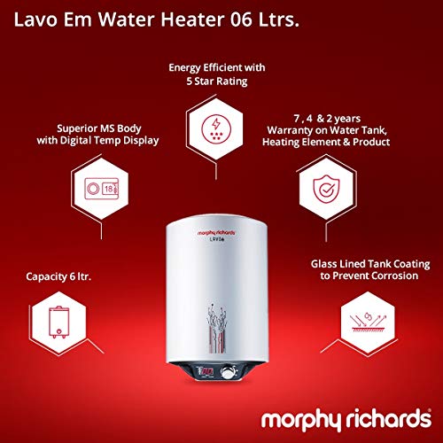 Drive away your early morning blues or late evening tiredness with hot water shower from the Morphy Richards Lavo EM Water Heater 6 Litres. No more last minute heating water on the gas burner. Modern design, chrome decor and premium look to enliven your bathroom.