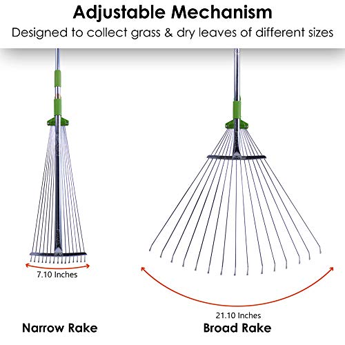 LIGHTWEIGHT & MULTI-USE: This ideal garden rake easily rakes up clippings, leaves and loose lawn and garden debris without damaging plants. Adjust garden rake width to 7.10″ for tight areas like under hedges or between flower beds without concern. Note that the garden rake is NOT designed for heavy duty use such as rock or heavy materials.