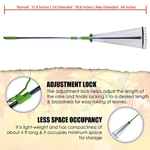 SMOOTH ADJUSTMENT & VERSATILE DESIGN: Smooth Handle helps easy adjustment of garden rake head in seconds and makes long-time gardening an enjoyable experience. The tight lock switch keeps rake head fixed in any width. Adjust rake head width, one rake will do all the jobs both in tight and wide spaces