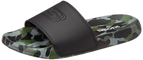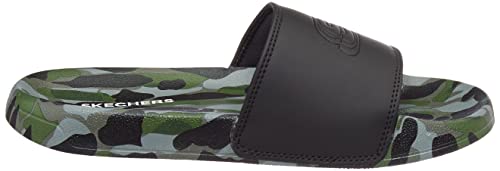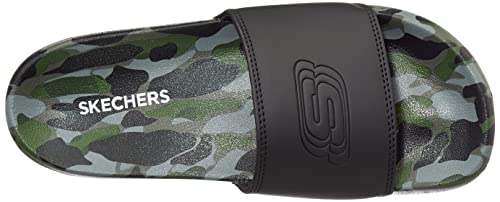Skechers sidelines slides feature a plush synthetic upper and quick-drying foam footbed that cradles your feet with soft cushioning. The synthetic upper shows off logo vamp for a sporty look and branding on footbed as well. The cushioned EVA outsole provides a soft and comfortable footbed.