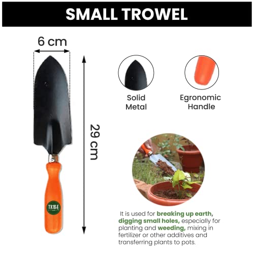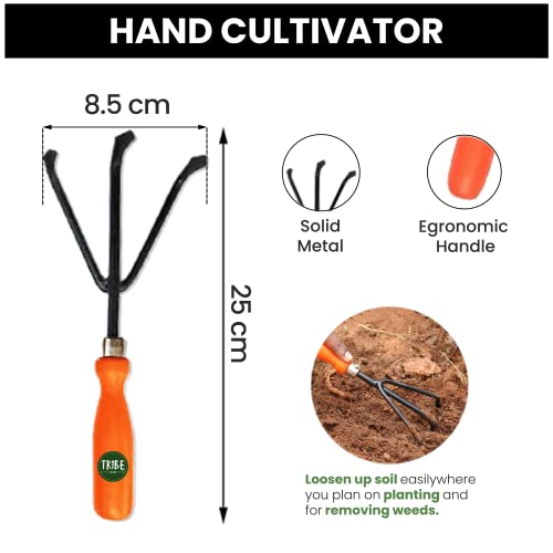 Tribe Made gardening tool set includes the following items: a small trowel, a hand fork, a hand cultivator. Welcome to the Tribe Made-Authentic Garden Store. Go Green! We manufacture and sell various types of gardening tools and garden maintenance products, and we believe that quality and value go hand in hand. Every Tribe Made product is carefully built to deliver exceptional quality. Right from the materials used, to detailed quality checks, to thoughtful improvements, quality is at the core of everything we do. Small trowel is a big garden tool that you use for digging small holes or removing weeds. It is used for breaking up earth, digging small holes, especially for planting and weeding, mixing in fertilizer or other additives, and transferring plants to pots. Hand fork is a small, hand-held gardening tool designed to be used with small plants or seedlings. Hand cultivator is a gardening tool that is used to turn the soil where you plan on planting and for removing weeds. In small flower or vegetable gardens, it can also be used like a small plough to dig the planting rows.