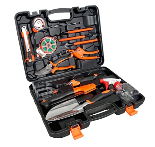 · MOSFiATA Garden Tool Set Contains 14 solid useful garden tools see above all that is included in this garden set. Including: 1* Small Sharp Shovel, 1* Small Round Shovel, 1* Big Round Shovel,, 1*Three Tine Rake, 1* Weeding Knife, 1* Spray Bottle, 1* Pruning Shear, 1* Small Rake , 1*Tie Rope, 1* Big Three Column Fork, 1* Weeder, 1* Grass Scissor, 1* Fruit & Vegetable Scissor, 1* Carry Case