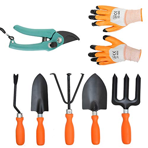 Package Contents:1 Purner, 1 Gloves, 1 Trowel, 1 Cultivator, 1 Transplanter, 1 Weeder, 1 Fork